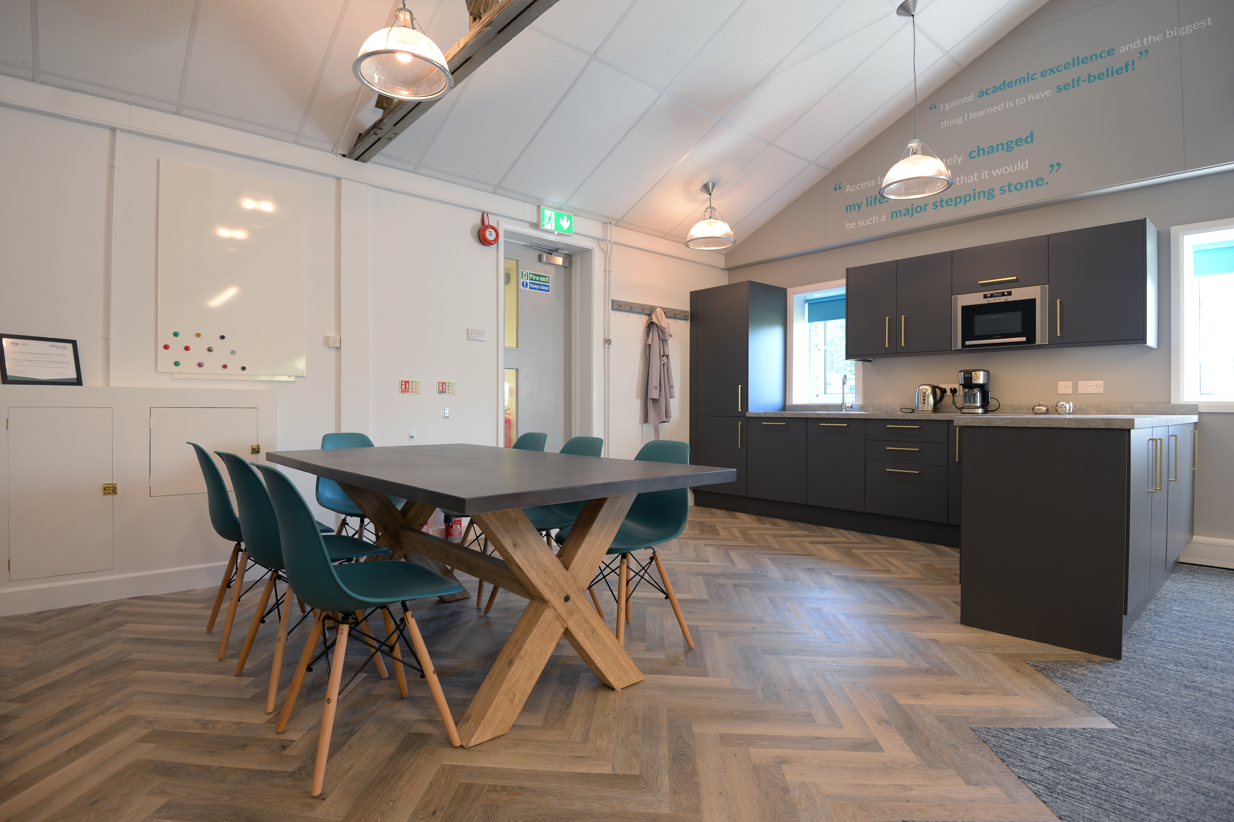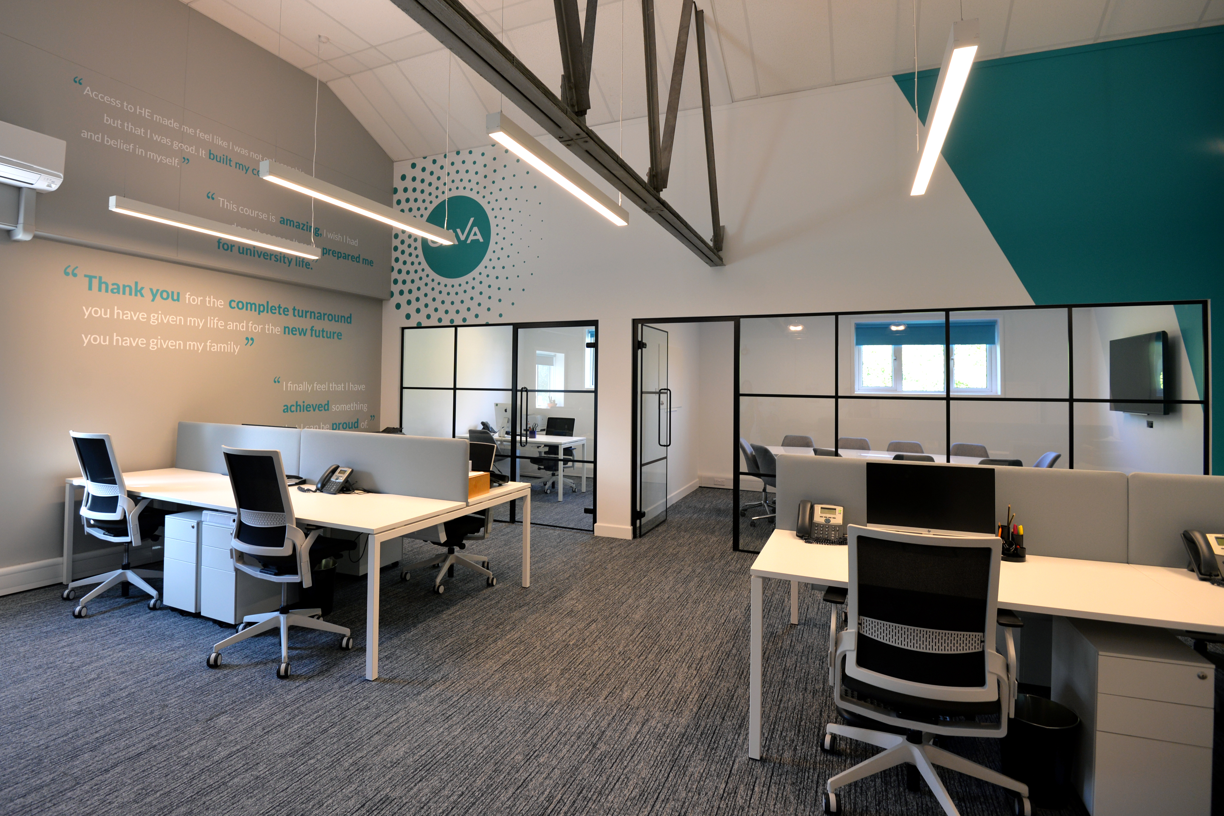 The Cambridge Access Validating Agency’s brand identity needed to be instantly recognisable within the office space which was achieved through multiple pieces of wall art with the brand colours threaded throughout the fit-out scheme. Loci chose to retain the look and feel of the raw steel truss to keep an industrial aesthetic which was then accentuated through the use of Crittall framed noise reduction glazing and concrete countertops.