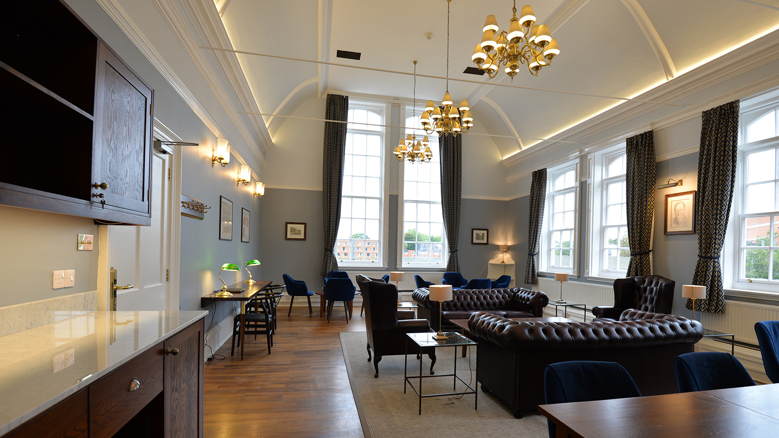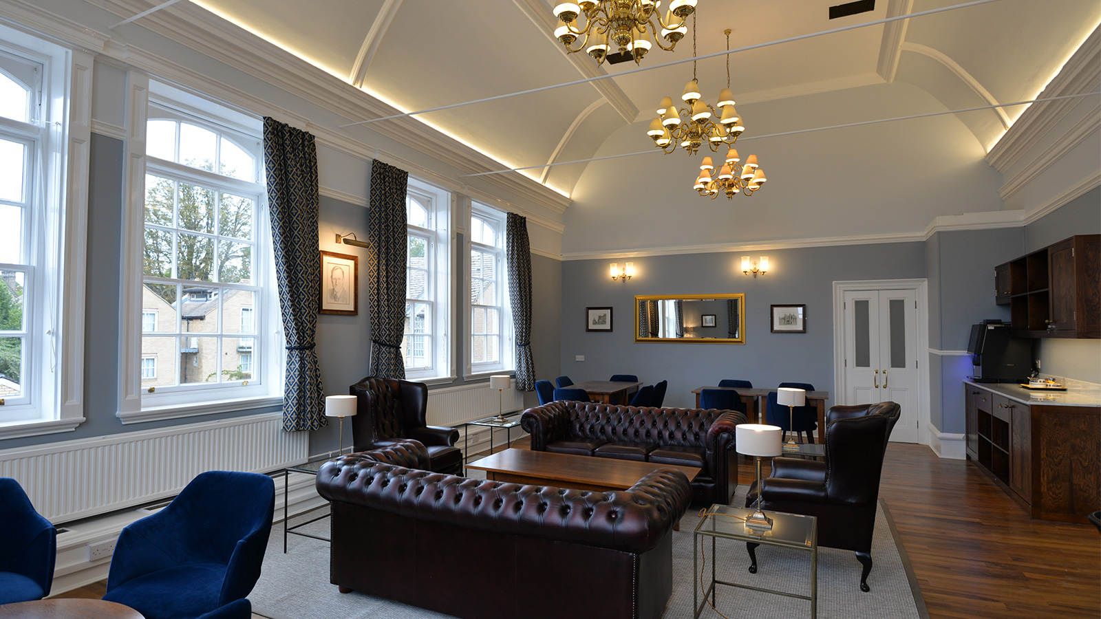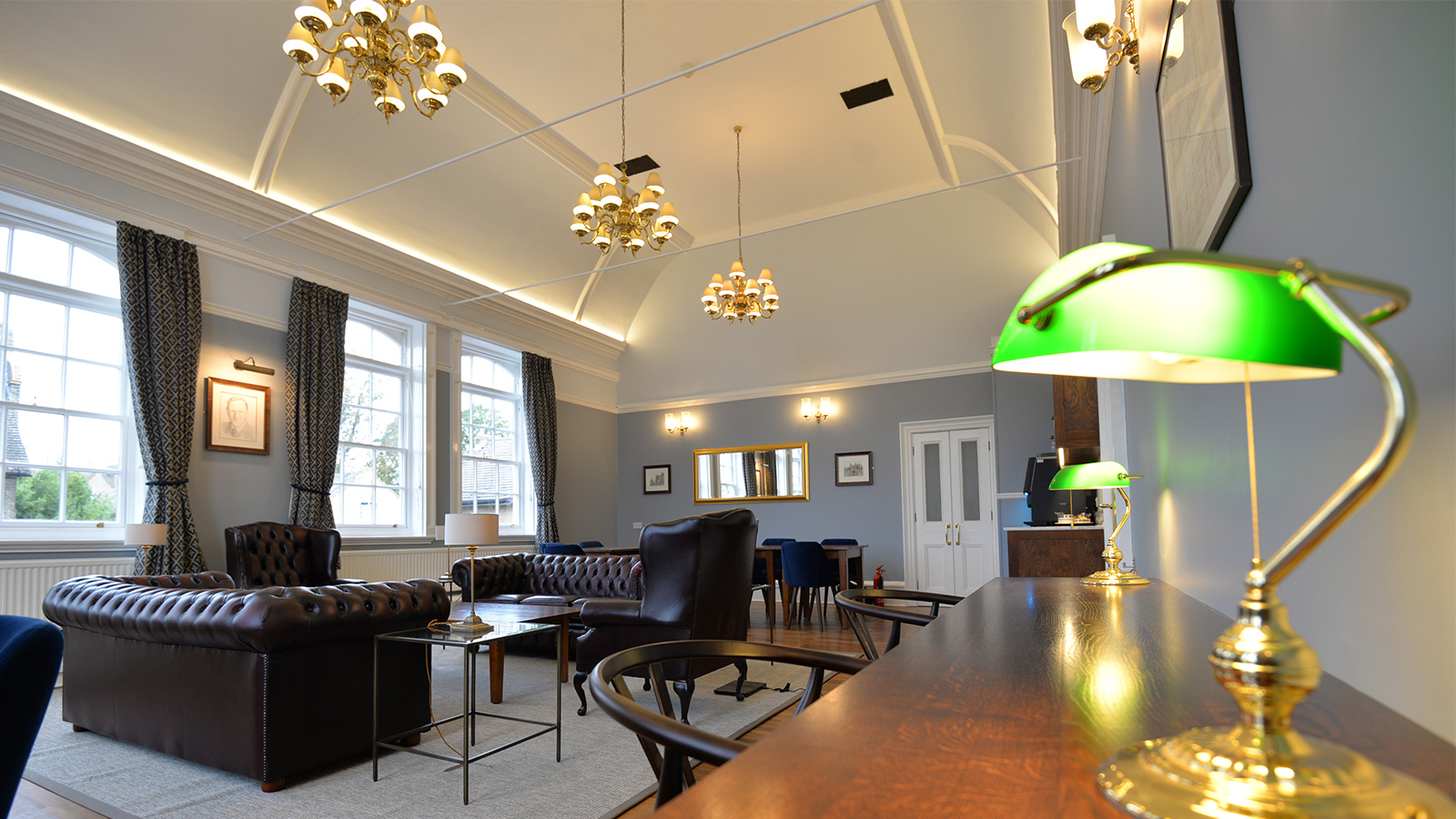 Following Loci Interiors hugely successful refurbishment of the MCR Bar, Pfeiffer Room and Combination Room at Hughes Hall, Cambridge, the College again asked Loci to undertake another refurbishment to update the stunning Fellows Room. Named after Dr. Desmond Hawkins, a ‘gentle, jovial and caring’ man who was Hughes Hall’s president from 1989 until 1993, The Desmond Hawkins Room was given a smart and elegant upgrade and re-design to offer intimate meeting spaces allowing for flexible and multi-use. Reflecting the architectural heritage and historical nature of Hughes Hall, the designs for the Desmond Hawkins Room are definitively appropriate and befitting.